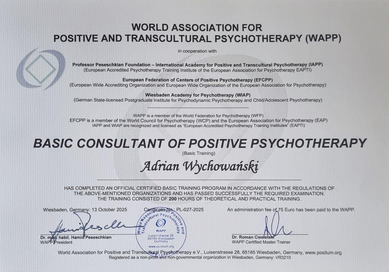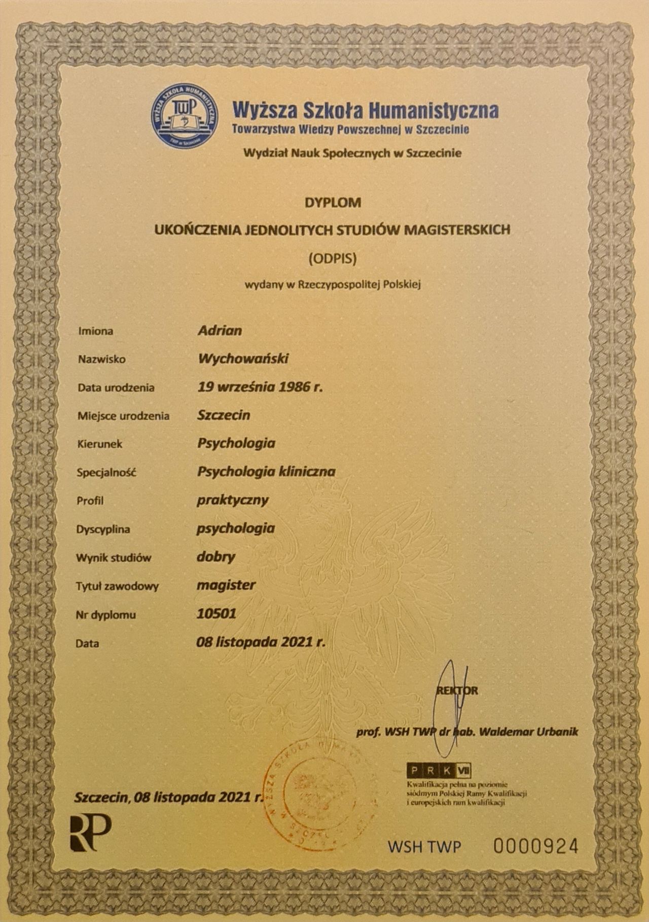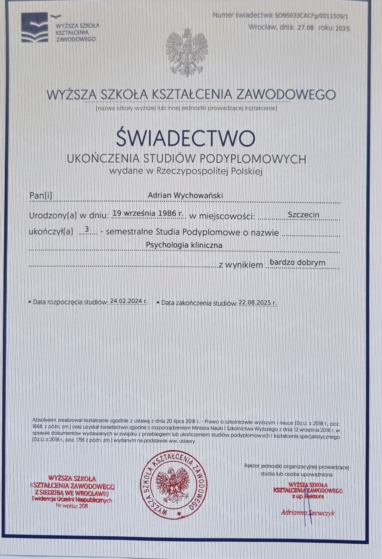 Jestem psychologiem, absolwentem WSH TWP w Szczecinie oraz Collegium Humanum w Warszawie. Należę do Polskiego Towarzystwa Psychologicznego oraz Polskiego Towarzystwa Psychiatrycznego. Moje kompetencje rozwijałem poprzez liczne studia podyplomowe, m.in. z psychotraumatologii, psychologii transportu, seksuologii klinicznej, terapii par i uzależnień, doradztwa psychospołecznego, zarządzania zasobami ludzkimi, public relations, a także z zakresu psychologii klinicznej oraz neuropsychologii. Ukończyłem również studia magisterskie z pedagogiki o specjalności doradztwo zawodowe i personalne. Uzyskałem także tytuł konsultanta Psychoterapii Pozytywnej z akredytacją Instytutu WAPP w Wiesbaden (Wiesbadener Akademie für Psychotherapie).